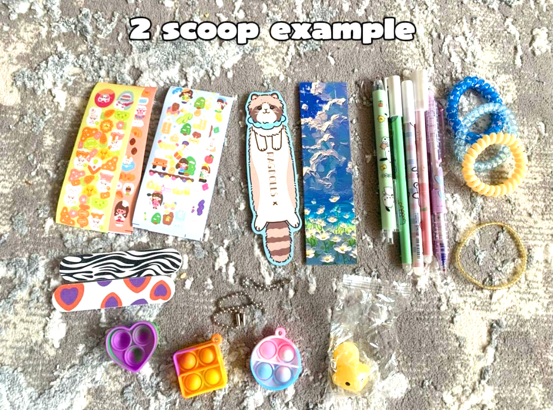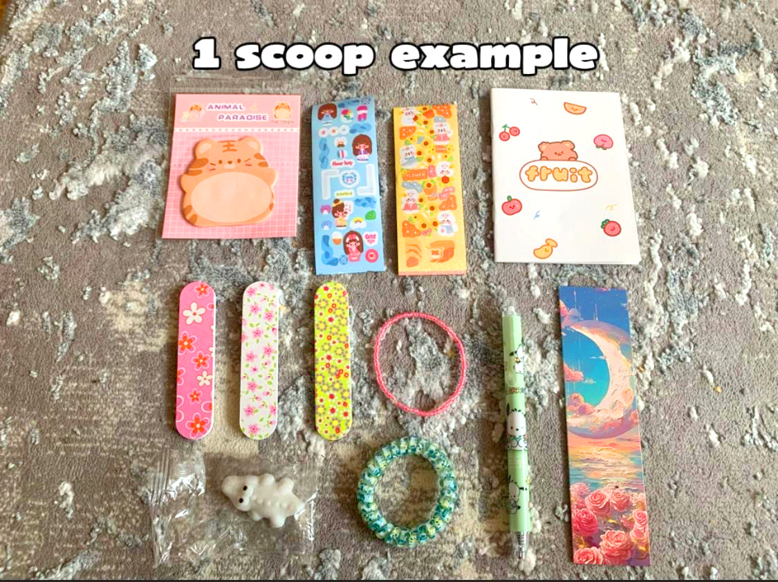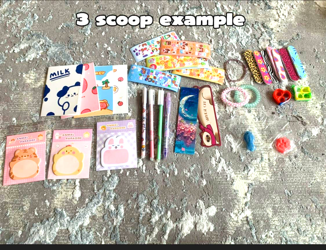This mystery scoop is a box of goodies, stationary, bracelets etc. These goodies can be useful to you every day while still being cute.
